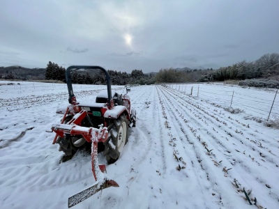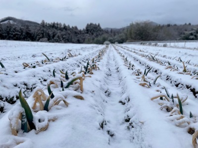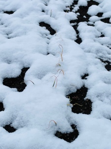 下仁田ねぎ苗(まだ育っていないから、芽にちかい)も、親ねぎ同様、乾きすぎて葉先が枯れているし、粘土質の苗床の一部は、地割れしていたから、昨夜から今朝の降雪は、恵みの雪になった。